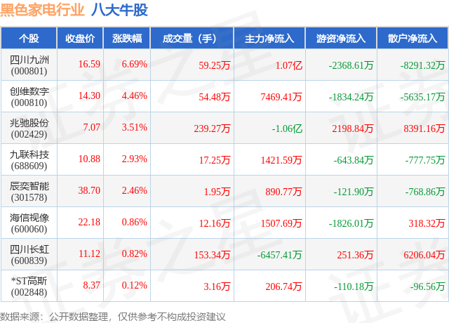 个股表现方面,黑色家电行业当日领涨股为四川九洲(000801),该股当日报收16.59,上涨6.69%,成交量59.25万,主力资金净流入1.07亿元。创维数字(000810)以上涨4.46%紧随其后,该股当日成交量54.48万,主力资金净流入7469.41万元。除此之外,兆驰股份(002429)、九联科技(688609)、辰奕智能(301578)均进入当日牛股之列。具体个股列表见下表:
