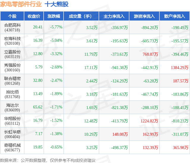 个股表现方面,家电零部件行业当日领跌股为合肥高科(430718),该股当日报收20.41,下跌5.77%,成交量3.52万,主力资金净流出356.97万元。宏海科技(920108)以下跌5.04%紧随其后,该股当日成交量3.61万,主力资金净流出195.63万元。除此之外,立霸股份(603519)、秀强股份(300160)、联合精密(001268)均进入当日熊股之列。具体个股列表见下表: