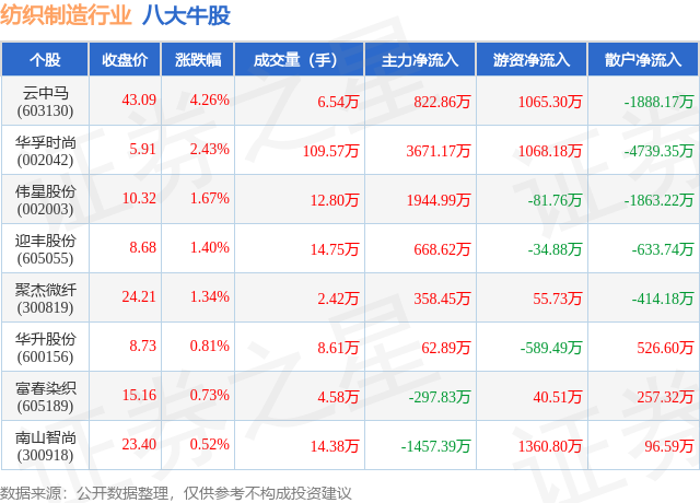 个股表现方面,纺织制造行业当日领涨股为云中马(603130),该股当日报收43.09,上涨4.26%,成交量6.54万,主力资金净流入822.86万元。华孚时尚(002042)以上涨2.43%紧随其后,该股当日成交量109.57万,主力资金净流入3671.17万元。除此之外,伟星股份(002003)、迎丰股份(605055)、聚杰微纤(300819)均进入当日牛股之列。具体个股列表见下表: