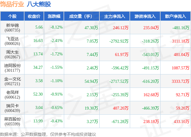 个股表现方面,饰品行业当日领跌股为新华锦(600735),该股当日报收5.66,下跌8.12%,成交量47.3万,主力资金净流入246.12万元。飞亚达(000026)以下跌2.41%紧随其后,该股当日成交量7.05万,主力资金净流出2792.92万元。除此之外,周大生(002867)、迪阿股份(301177)、金一文化(002721)均进入当日熊股之列。具体个股列表见下表: