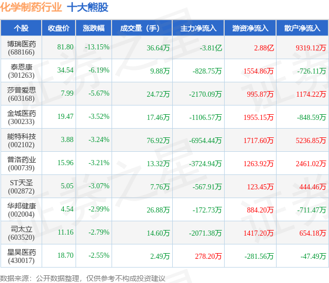 个股表现方面,化学制药行业当日领跌股为博瑞医药(688166),该股当日报收81.8,下跌13.15%,成交量36.64万,主力资金净流出3.81亿元。泰恩康(301263)以下跌6.19%紧随其后,该股当日成交量9.88万,主力资金净流出828.75万元。除此之外,莎普爱思(603168)、金城医药(300233)、能特科技(002102)均进入当日熊股之列。具体个股列表见下表: