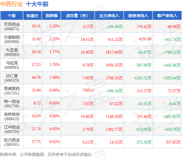 个股表现方面,中药行业当日领涨股为天目药业(600671),该股当日报收18.31,上涨2.29%,成交量3.57万,主力资金净流出236.49万元。方盛制药(603998)以上涨2.23%紧随其后,该股当日成交量18.61万,主力资金净流入611.32万元。除此之外,九芝堂(000989)、马应龙(600993)、达仁堂(600329)均进入当日牛股之列。具体个股列表见下表: