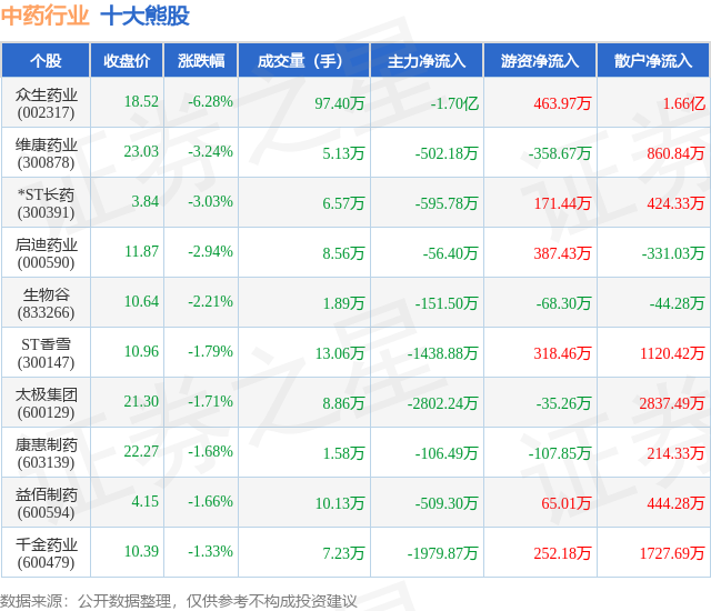 个股表现方面,中药行业当日领跌股为众生药业(002317),该股当日报收18.52,下跌6.28%,成交量97.4万,主力资金净流出1.7亿元。维康药业(300878)以下跌3.24%紧随其后,该股当日成交量5.13万,主力资金净流出502.18万元。除此之外,*ST长药(300391)、启迪药业(000590)、生物谷(833266)均进入当日熊股之列。具体个股列表见下表:
