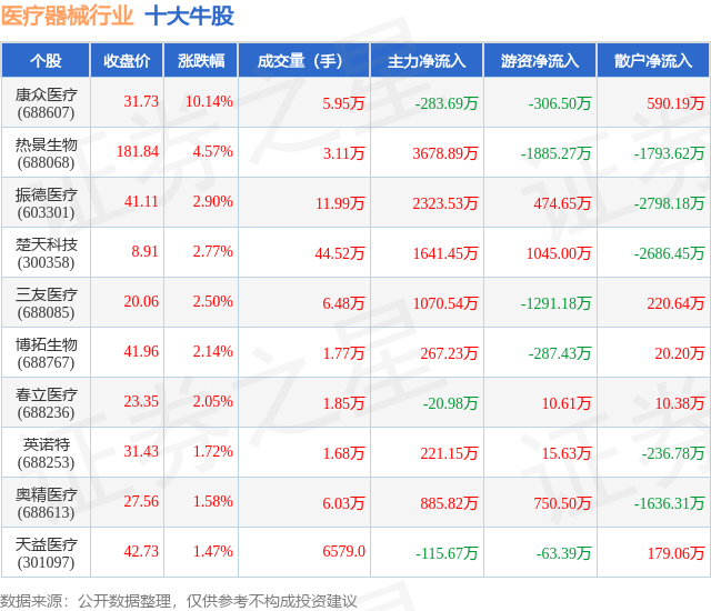 个股表现方面,医疗器械行业当日领涨股为康众医疗(688607),该股当日报收31.73,上涨10.14%,成交量5.95万,主力资金净流出283.69万元。热景生物(688068)以上涨4.57%紧随其后,该股当日成交量3.11万,主力资金净流入3678.89万元。除此之外,振德医疗(603301)、楚天科技(300358)、三友医疗(688085)均进入当日牛股之列。具体个股列表见下表: