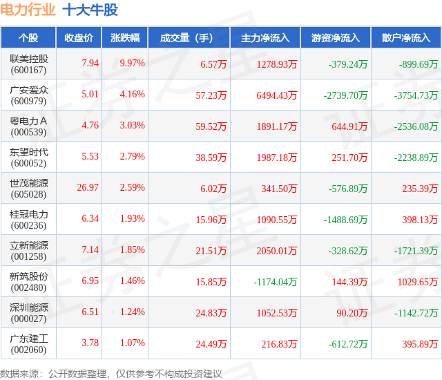 个股表现方面,电力行业当日领涨股为联美控股(600167),该股当日报收7.94,上涨9.97%,成交量6.57万,主力资金净流入1278.93万元。广安爱众(600979)以上涨4.16%紧随其后,该股当日成交量57.23万,主力资金净流入6494.43万元。除此之外,粤电力A(000539)、东望时代(600052)、世茂能源(605028)均进入当日牛股之列。具体个股列表见下表: