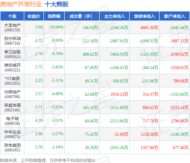 个股表现方面,房地产开发行业当日领跌股为大龙地产(600159),该股当日报收3.04,下跌10.06%,成交量146.93万,主力资金净流出2240.26万元。苏宁环球(000718)以下跌9.93%紧随其后,该股当日成交量222.18万,主力资金净流出2887.92万元。除此之外,香江控股(600162)、津投城开(600322)、*ST南置(002305)均进入当日熊股之列。具体个股列表见下表: