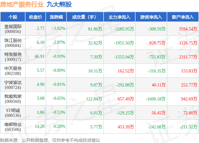 个股表现方面,房地产服务行业当日领跌股为皇庭国际(000056),该股当日报收2.77,下跌3.82%,成交量81.86万,主力资金净流出3285.95万元。珠江股份(600684)以下跌2.87%紧随其后,该股当日成交量32.82万,主力资金净流出1955.5万元。除此之外,特发服务(300917)、中天服务(002188)、宁波富达(600724)均进入当日熊股之列。具体个股列表见下表: