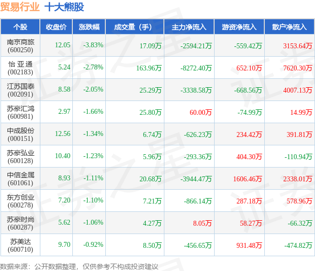 个股表现方面,贸易行业当日领跌股为南京商旅(600250),该股当日报收12.05,下跌3.83%,成交量17.09万,主力资金净流出2594.21万元。怡 亚 通(002183)以下跌2.78%紧随其后,该股当日成交量163.96万,主力资金净流出8272.4万元。除此之外,江苏国泰(002091)、苏豪汇鸿(600981)、中成股份(000151)均进入当日熊股之列。具体个股列表见下表: