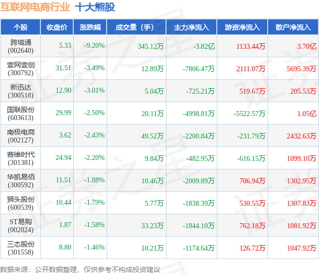 个股表现方面,互联网电商行业当日领跌股为跨境通(002640),该股当日报收5.33,下跌9.2%,成交量345.12万,主力资金净流出3.82亿元。壹网壹创(300792)以下跌3.49%紧随其后,该股当日成交量12.89万,主力资金净流出7806.47万元。除此之外,新迅达(300518)、国联股份(603613)、南极电商(002127)均进入当日熊股之列。具体个股列表见下表: