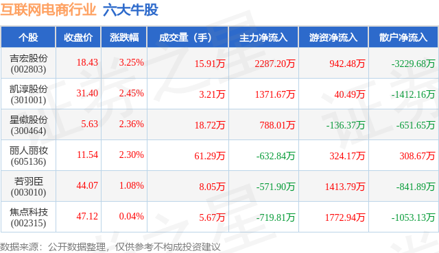 个股表现方面,互联网电商行业当日领涨股为吉宏股份(002803),该股当日报收18.43,上涨3.25%,成交量15.91万,主力资金净流入2287.2万元。凯淳股份(301001)以上涨2.45%紧随其后,该股当日成交量3.21万,主力资金净流入1371.67万元。除此之外,星徽股份(300464)、丽人丽妆(605136)、若羽臣(003010)均进入当日牛股之列。具体个股列表见下表: