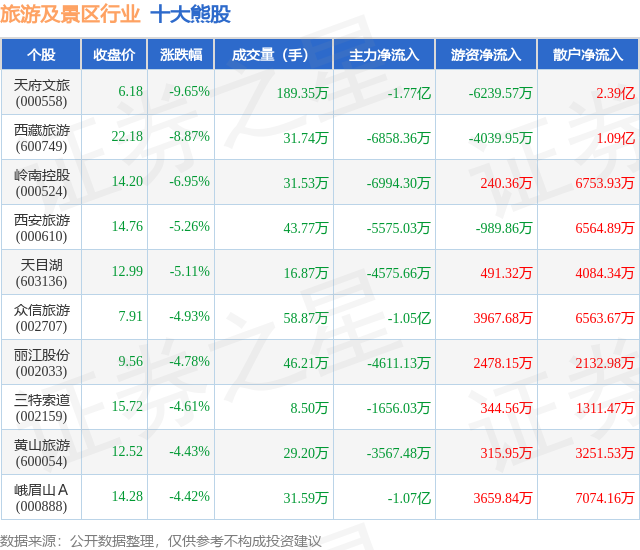 个股表现方面,旅游及景区行业当日领跌股为天府文旅(000558),该股当日报收6.18,下跌9.65%,成交量189.35万,主力资金净流出1.77亿元。西藏旅游(600749)以下跌8.87%紧随其后,该股当日成交量31.74万,主力资金净流出6858.36万元。除此之外,岭南控股(000524)、西安旅游(000610)、天目湖(603136)均进入当日熊股之列。具体个股列表见下表: