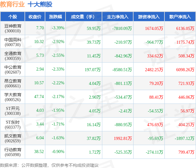个股表现方面,教育行业当日领跌股为豆神教育(300010),该股当日报收7.7,下跌3.39%,成交量59.95万,主力资金净流出7810.09万元。中国高科(600730)以下跌2.92%紧随其后,该股当日成交量39.73万,主力资金净流出210.97万元。除此之外,全通教育(300359)、中公教育(002607)、昂立教育(600661)均进入当日熊股之列。具体个股列表见下表: