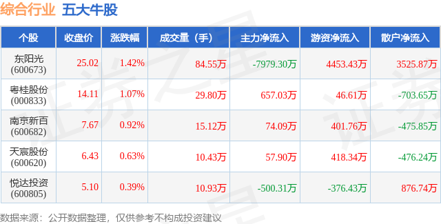 个股表现方面,综合行业当日领涨股为东阳光(600673),该股当日报收25.02,上涨1.42%,成交量84.55万,主力资金净流出7979.3万元。粤桂股份(000833)以上涨1.07%紧随其后,该股当日成交量29.8万,主力资金净流入657.03万元。除此之外,南京新百(600682)、天宸股份(600620)、悦达投资(600805)均进入当日牛股之列。具体个股列表见下表: