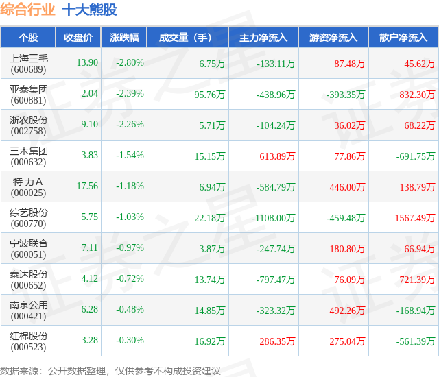 个股表现方面,综合行业当日领跌股为上海三毛(600689),该股当日报收13.9,下跌2.8%,成交量6.75万,主力资金净流出133.11万元。亚泰集团(600881)以下跌2.39%紧随其后,该股当日成交量95.76万,主力资金净流出438.96万元。除此之外,浙农股份(002758)、三木集团(000632)、特 力A(000025)均进入当日熊股之列。具体个股列表见下表: