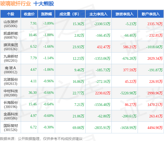 个股表现方面,玻璃玻纤行业当日领跌股为山东玻纤(605006),该股当日报收7.91,下跌3.89%,成交量15.36万,主力资金净流出2330.53万元。凯盛新能(600876)以下跌1.88%紧随其后,该股当日成交量2.82万,主力资金净流出166.45万元。除此之外,旗滨集团(601636)、九鼎新材(002201)、南 玻A(000012)均进入当日熊股之列。具体个股列表见下表: