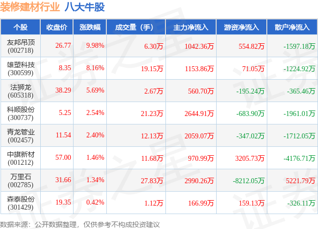 个股表现方面,装修建材行业当日领涨股为友邦吊顶(002718),该股当日报收26.77,上涨9.98%,成交量6.3万,主力资金净流入1042.36万元。雄塑科技(300599)以上涨8.16%紧随其后,该股当日成交量19.15万,主力资金净流入1153.86万元。除此之外,法狮龙(605318)、科顺股份(300737)、青龙管业(002457)均进入当日牛股之列。具体个股列表见下表: