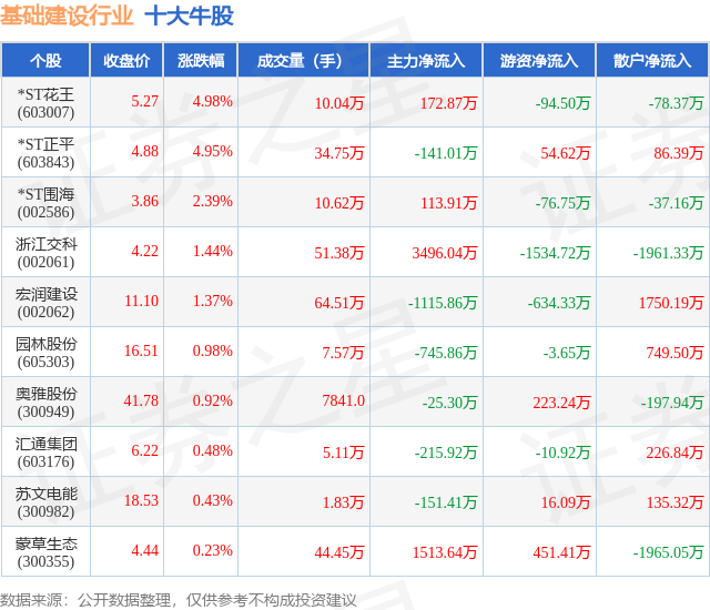 个股表现方面,基础建设行业当日领涨股为*ST花王(603007),该股当日报收5.27,上涨4.98%,成交量10.04万,主力资金净流入172.87万元。*ST正平(603843)以上涨4.95%紧随其后,该股当日成交量34.75万,主力资金净流出141.01万元。除此之外,*ST围海(002586)、浙江交科(002061)、宏润建设(002062)均进入当日牛股之列。具体个股列表见下表: