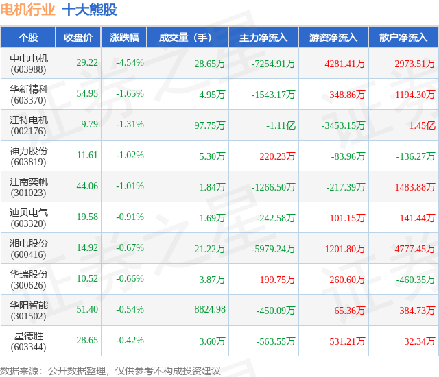 个股表现方面,电机行业当日领跌股为中电电机(603988),该股当日报收29.22,下跌4.54%,成交量28.65万,主力资金净流出7254.91万元。华新精科(603370)以下跌1.65%紧随其后,该股当日成交量4.95万,主力资金净流出1543.17万元。除此之外,江特电机(002176)、神力股份(603819)、江南奕帆(301023)均进入当日熊股之列。具体个股列表见下表: