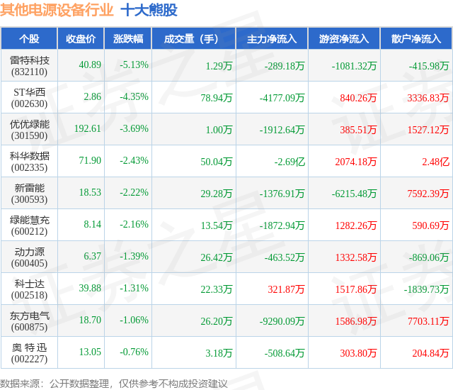 个股表现方面,其他电源设备行业当日领跌股为雷特科技(832110),该股当日报收40.89,下跌5.13%,成交量1.29万,主力资金净流出289.18万元。ST华西(002630)以下跌4.35%紧随其后,该股当日成交量78.94万,主力资金净流出4177.09万元。除此之外,优优绿能(301590)、科华数据(002335)、新雷能(300593)均进入当日熊股之列。具体个股列表见下表: