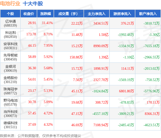 个股表现方面,电池行业当日领涨股为亿华通(688339),该股当日报收28.91,上涨11.41%,成交量22.22万,主力资金净流入3434.51万元。科达利(002850)以上涨8.71%紧随其后,该股当日成交量11.48万,主力资金净流入1.5亿元。除此之外,安孚科技(603031)、先导智能(300450)、金银河(300619)均进入当日牛股之列。具体个股列表见下表: