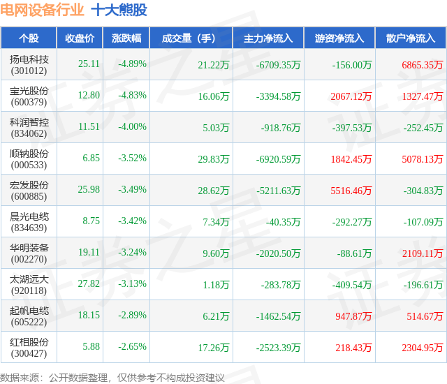个股表现方面,电网设备行业当日领跌股为扬电科技(301012),该股当日报收25.11,下跌4.89%,成交量21.22万,主力资金净流出6709.35万元。宝光股份(600379)以下跌4.83%紧随其后,该股当日成交量16.06万,主力资金净流出3394.58万元。除此之外,科润智控(834062)、顺钠股份(000533)、宏发股份(600885)均进入当日熊股之列。具体个股列表见下表: