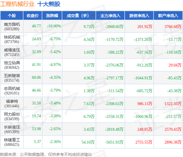 个股表现方面,工程机械行业当日领跌股为南方路机(603280),该股当日报收40.77,下跌10.0%,成交量9.73万,主力资金净流出3968.6万元。铁拓机械(873706)以下跌6.75%紧随其后,该股当日成交量4.34万,主力资金净流出1170.72万元。除此之外,威博液压(871245)、恒立钻具(836942)、五新隧装(835174)均进入当日熊股之列。具体个股列表见下表: