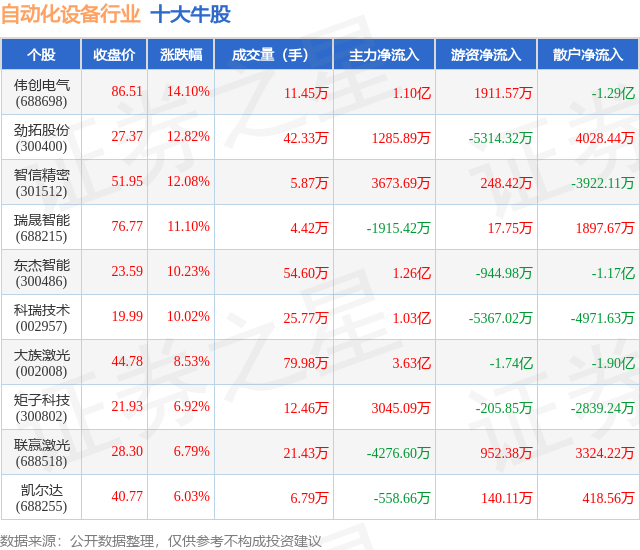 个股表现方面,自动化设备行业当日领涨股为伟创电气(688698),该股当日报收86.51,上涨14.1%,成交量11.45万,主力资金净流入1.1亿元。劲拓股份(300400)以上涨12.82%紧随其后,该股当日成交量42.33万,主力资金净流入1285.89万元。除此之外,智信精密(301512)、瑞晟智能(688215)、东杰智能(300486)均进入当日牛股之列。具体个股列表见下表: