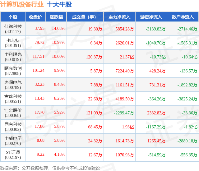 个股表现方面,计算机设备行业当日领涨股为佳缘科技(301117),该股当日报收37.95,上涨14.03%,成交量19.3万,主力资金净流入5854.28万元。卡莱特(301391)以上涨10.97%紧随其后,该股当日成交量6.34万,主力资金净流入2626.01万元。除此之外,中科曙光(603019)、曙光数创(872808)、唐源电气(300789)均进入当日牛股之列。具体个股列表见下表:
