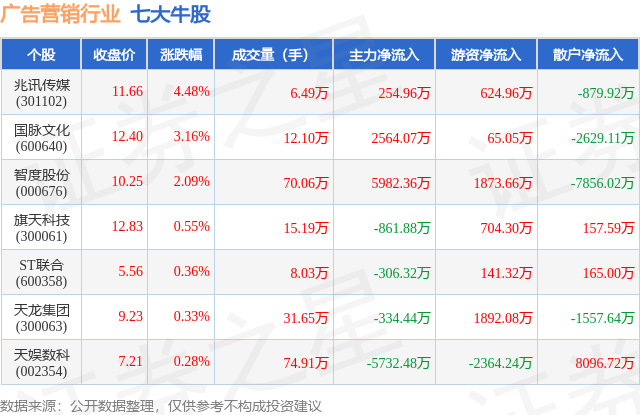 个股表现方面,广告营销行业当日领涨股为兆讯传媒(301102),该股当日报收11.66,上涨4.48%,成交量6.49万,主力资金净流入254.96万元。国脉文化(600640)以上涨3.16%紧随其后,该股当日成交量12.1万,主力资金净流入2564.07万元。除此之外,智度股份(000676)、旗天科技(300061)、ST联合(600358)均进入当日牛股之列。具体个股列表见下表: