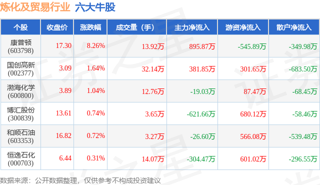 个股表现方面,炼化及贸易行业当日领涨股为康普顿(603798),该股当日报收17.3,上涨8.26%,成交量13.92万,主力资金净流入895.87万元。国创高新(002377)以上涨1.64%紧随其后,该股当日成交量32.14万,主力资金净流入381.85万元。除此之外,渤海化学(600800)、博汇股份(300839)、和顺石油(603353)均进入当日牛股之列。具体个股列表见下表: