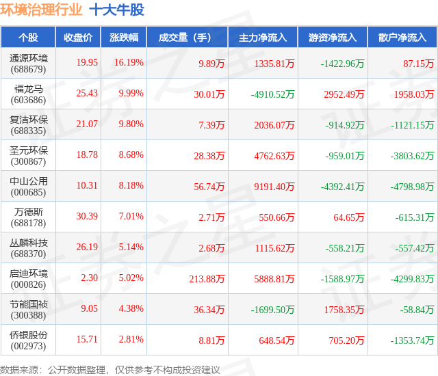 个股表现方面,环境治理行业当日领涨股为通源环境(688679),该股当日报收19.95,上涨16.19%,成交量9.89万,主力资金净流入1335.81万元。福龙马(603686)以上涨9.99%紧随其后,该股当日成交量30.01万,主力资金净流出4910.52万元。除此之外,复洁环保(688335)、圣元环保(300867)、中山公用(000685)均进入当日牛股之列。具体个股列表见下表: