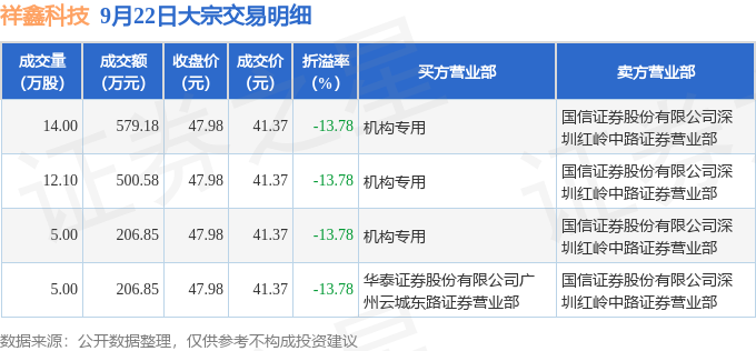 证券之星消息,9月22日祥鑫科技发生大宗交易,交易数据如下: