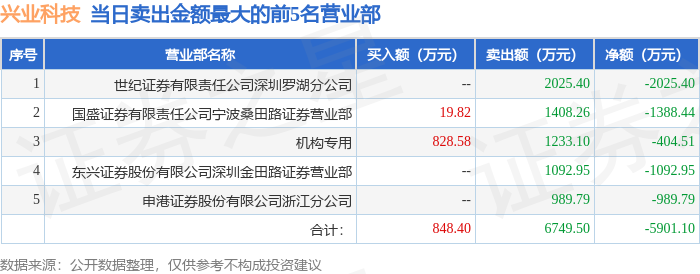 证券之星消息,沪深交易所2025年9月22日公布的交易公开信息显示,兴业科技(002674)因日跌幅偏离值达到7%的前5只证券登上龙虎榜。此次是近5个交易日内第2次上榜。