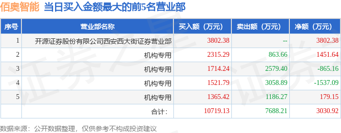 证券之星消息,沪深交易所2025年9月22日公布的交易公开信息显示,佰奥智能(300836)因日涨幅达到15%的前5只证券登上龙虎榜。此次是近5个交易日内第1次上榜。