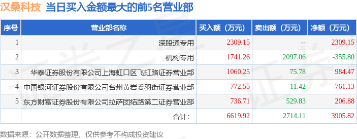 证券之星消息,沪深交易所2025年9月22日公布的交易公开信息显示,汉桑科技(301491)因日换手率达到30%的前5只证券登上龙虎榜。此次是近5个交易日内第1次上榜。