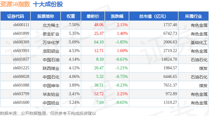证券之星消息,9月22日,资源50(000092)指数报收于4134.32点,涨0.32%,成交624.64亿元,换手率0.64%。当日该指数成份股中,上涨的有15家,中金黄金以9.42%的涨幅领涨,下跌的有35家,华鲁恒升以4.03%的跌幅领跌。