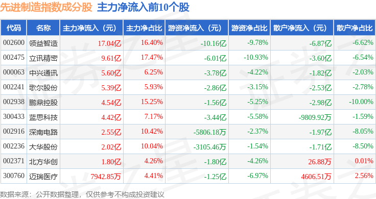 资金流向方面,先进制造(399260)指数成份股当日主力资金净流出合计16.39亿元,游资资金净流出合计11.62亿元,散户资金净流入合计28.02亿元。成份股资金流向详情见下表: