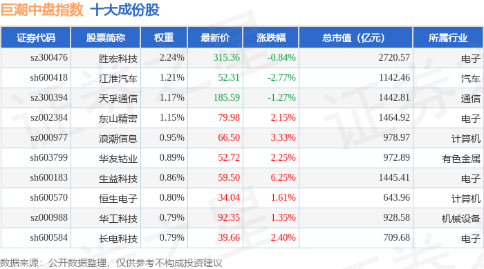 巨潮中盘(399315)指数十大成份股详情如下: