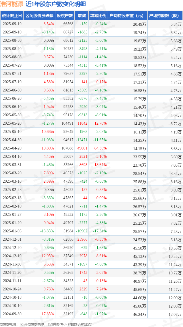 从股价来看,2025年9月10日至2025年9月19日,淮河能源区间涨幅为3.54%,在此期间股东户数减少159.0户,减幅为0.24%。