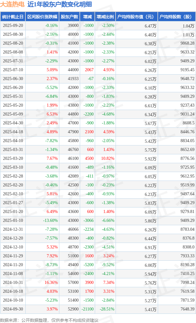 从股价来看,2025年9月10日至2025年9月20日,大连热电区间跌幅为0.16%,在此期间股东户数减少1000.0户,减幅为2.5%。