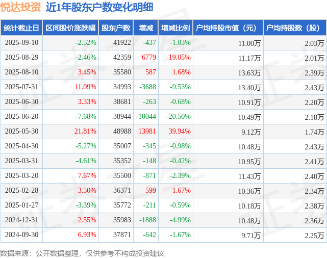 从股价来看,2025年8月29日至2025年9月10日,悦达投资区间跌幅为2.52%,在此期间股东户数减少437.0户,减幅为1.03%。