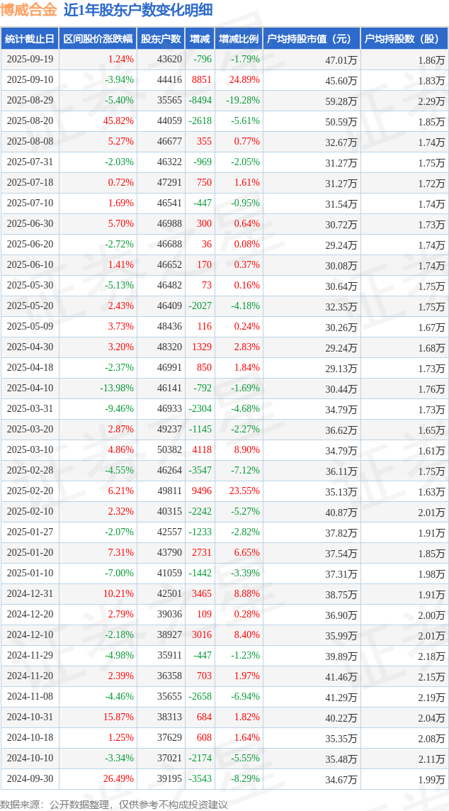 从股价来看,2025年9月10日至2025年9月19日,博威合金区间涨幅为1.24%,在此期间股东户数减少796.0户,减幅为1.79%。