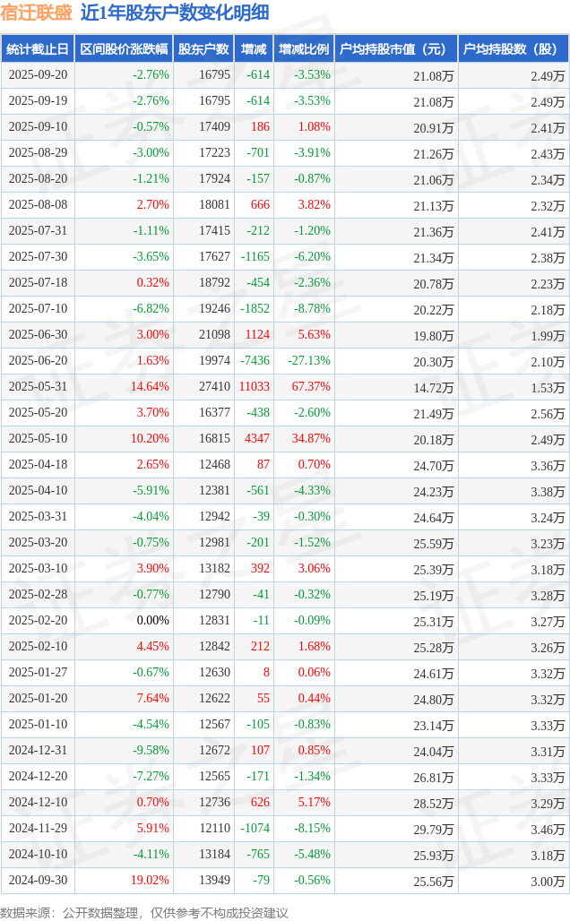 证券之星消息,近日宿迁联盛披露,截至2025年9月20日公司股东户数为1.68万户,较9月10日减少614.0户,减幅为3.53%。户均持股数量由上期的2.49万股减少至2.49万股,户均持股市值为21.08万元。