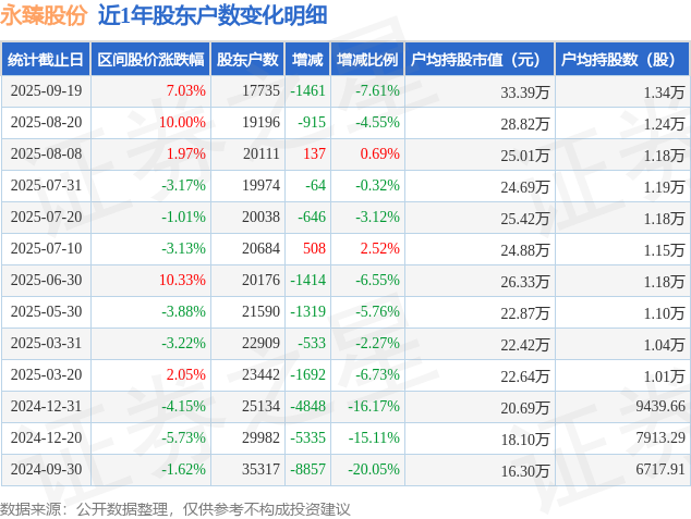 从股价来看,2025年8月20日至2025年9月19日,永臻股份区间涨幅为7.03%,在此期间股东户数减少1461.0户,减幅为7.61%。