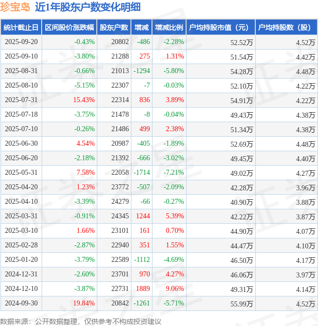 从股价来看,2025年9月10日至2025年9月20日,珍宝岛区间跌幅为0.43%,在此期间股东户数减少486.0户,减幅为2.28%。