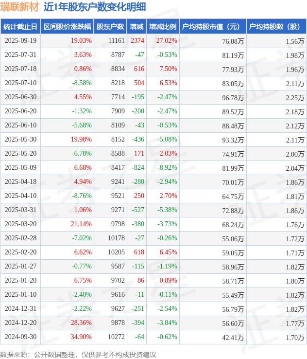 从股价来看,2025年7月31日至2025年9月19日,瑞联新材区间涨幅为19.03%,在此期间股东户数增加2374.0户,增幅为27.02%。