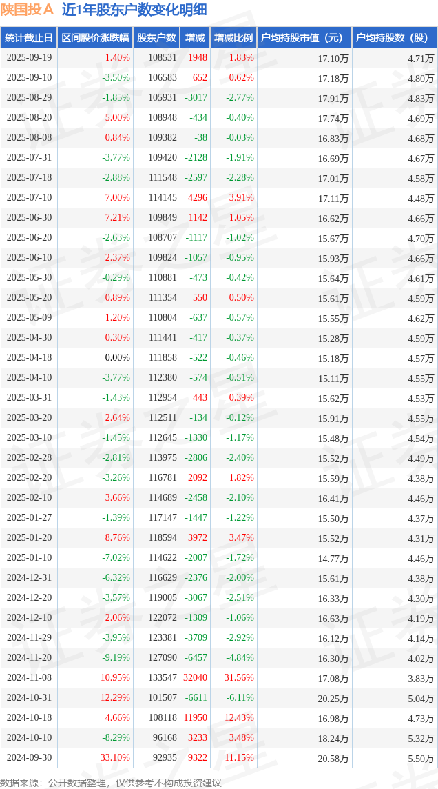 从股价来看,2025年9月10日至2025年9月19日,陕国投A区间涨幅为1.4%,在此期间股东户数增加1948.0户,增幅为1.83%。