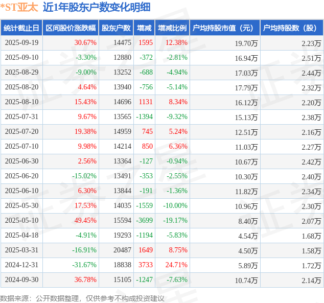 从股价来看,2025年9月10日至2025年9月19日,*ST亚太区间涨幅为30.67%,在此期间股东户数增加1595.0户,增幅为12.38%。
