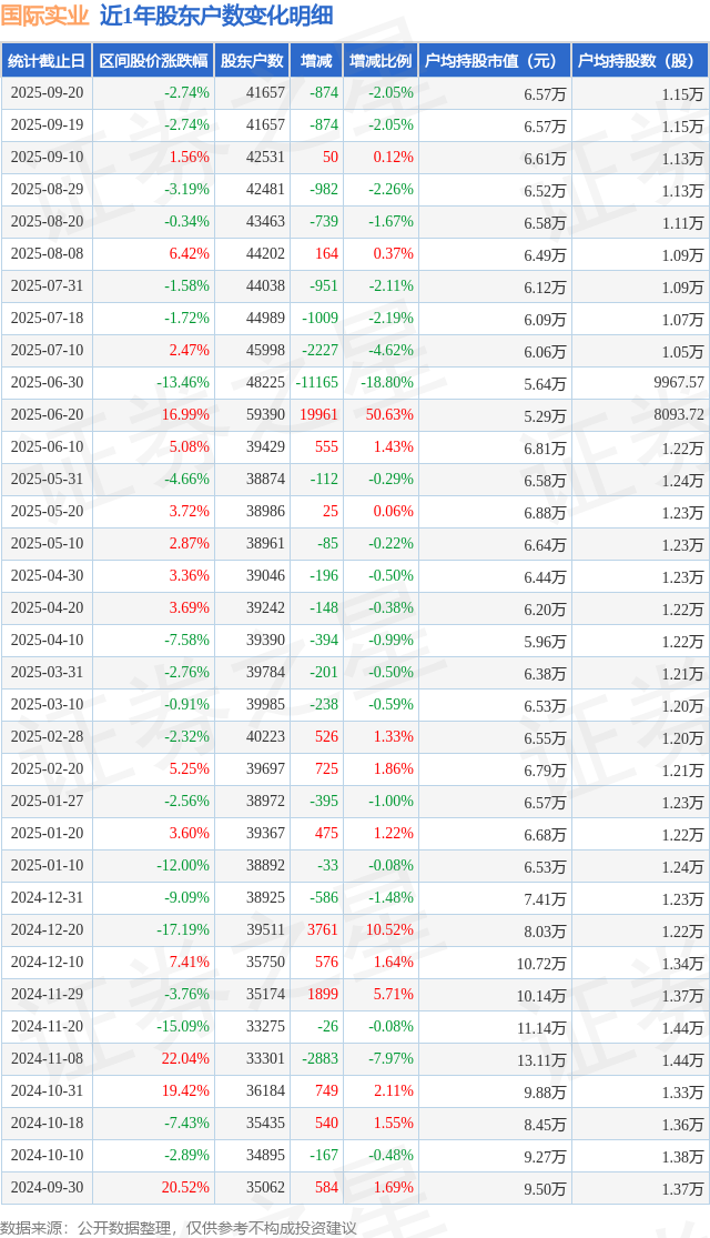 从股价来看,2025年9月10日至2025年9月20日,国际实业区间跌幅为2.74%,在此期间股东户数减少874.0户,减幅为2.05%。