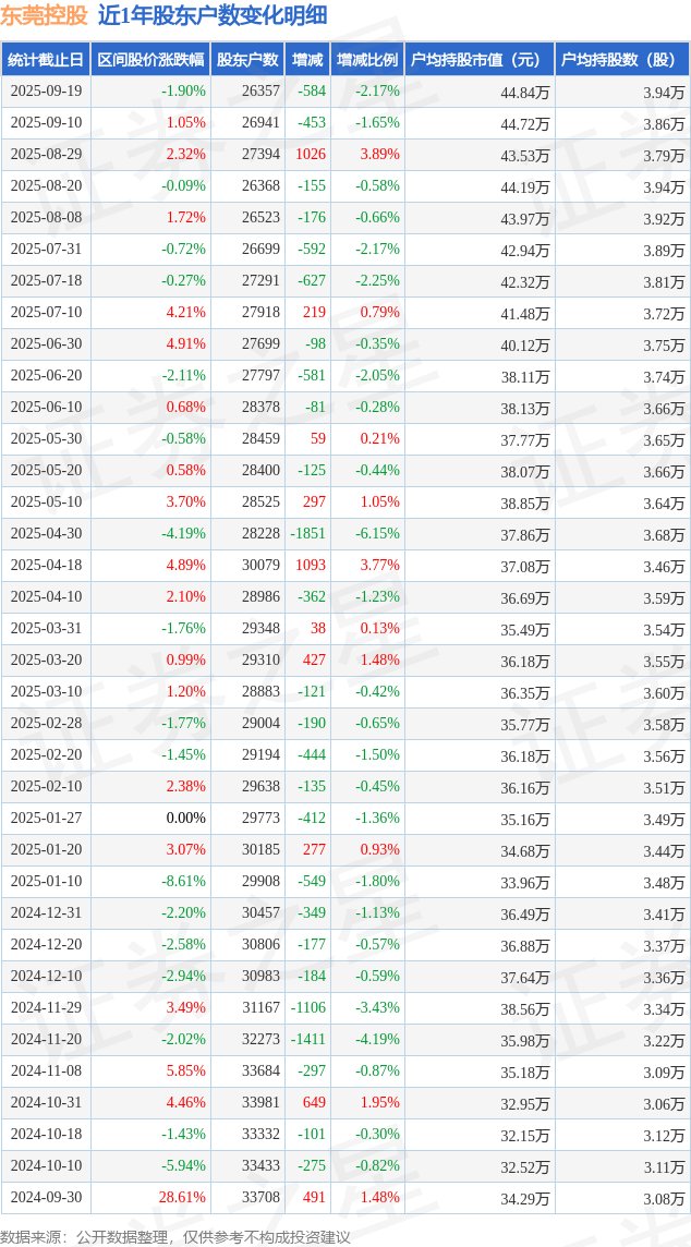 从股价来看,2025年9月10日至2025年9月19日,东莞控股区间跌幅为1.9%,在此期间股东户数减少584.0户,减幅为2.17%。